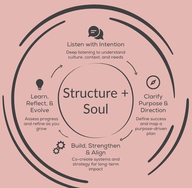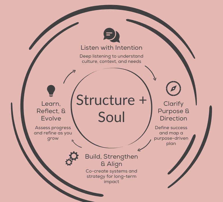 To bring this work to life, we use a thoughtful, human-centered cycle that blends structure with soul and supports your organization every step of the way.